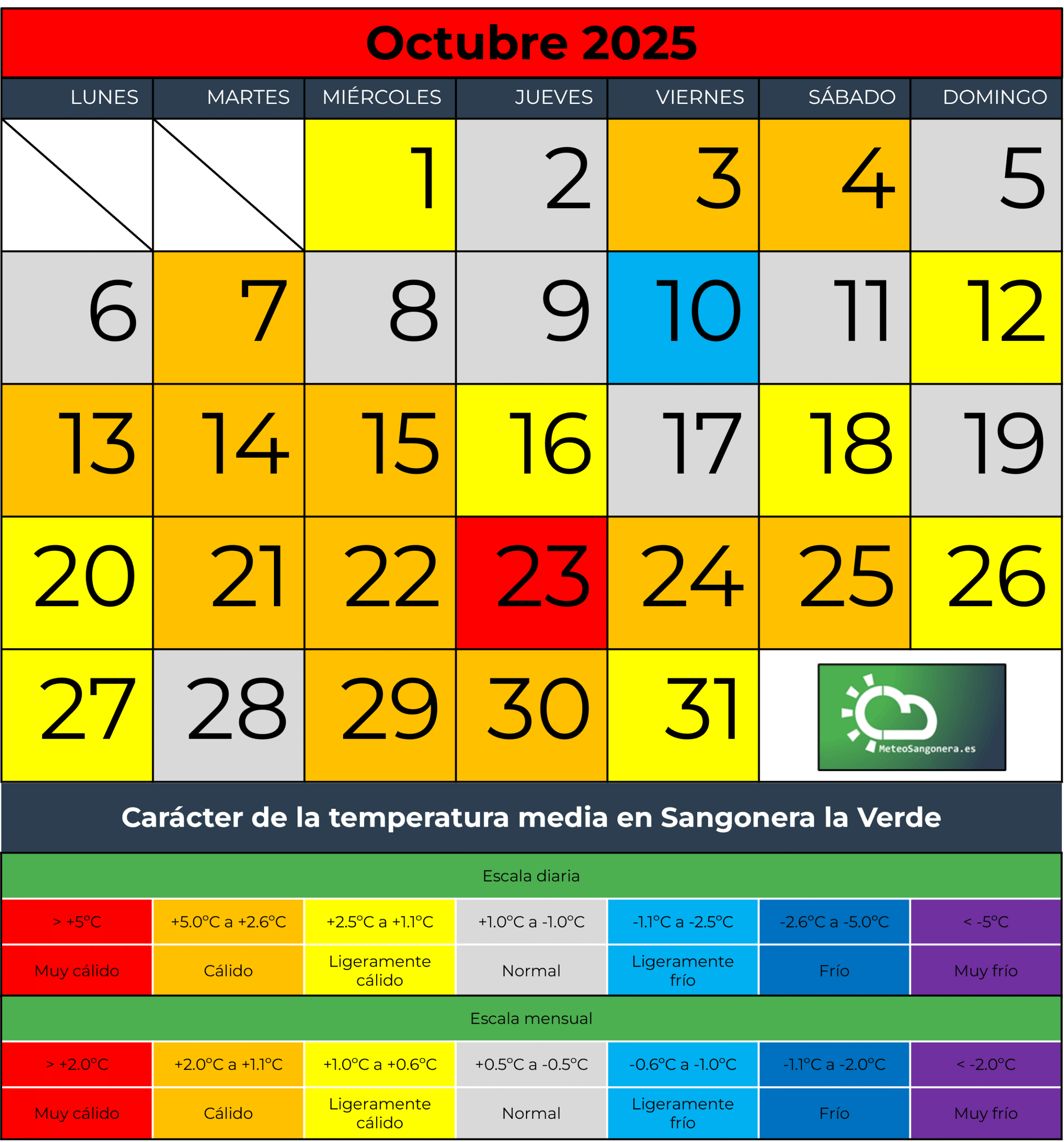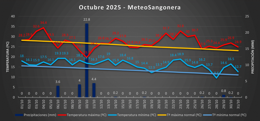 Nos estamos acostumbrado en los últimos años a que no llegue el otoño durante el mes de octubre, al menos en cuanto a las temperaturas. Desde 2022 incluido, la temperatura media del décimo mes del año en Sangonera la Verde está entre los 21.5ºC y los 22ºC.